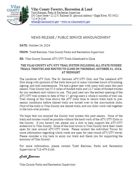 Trails Closing soon. Vilas County PSA